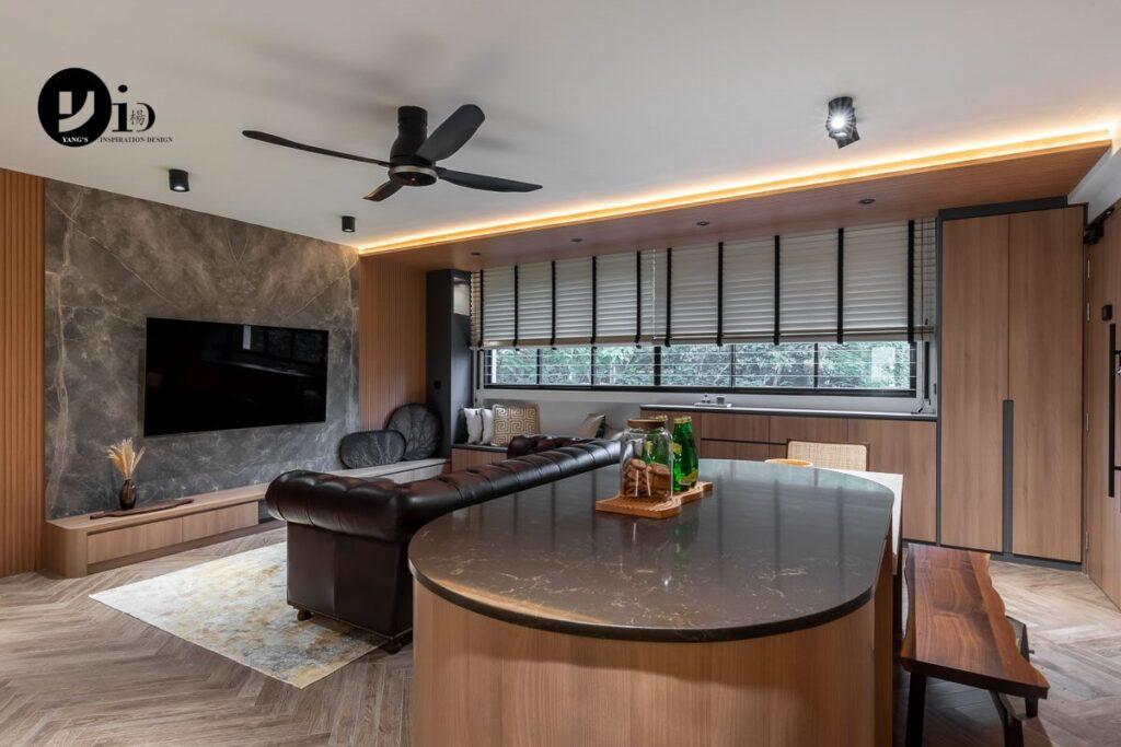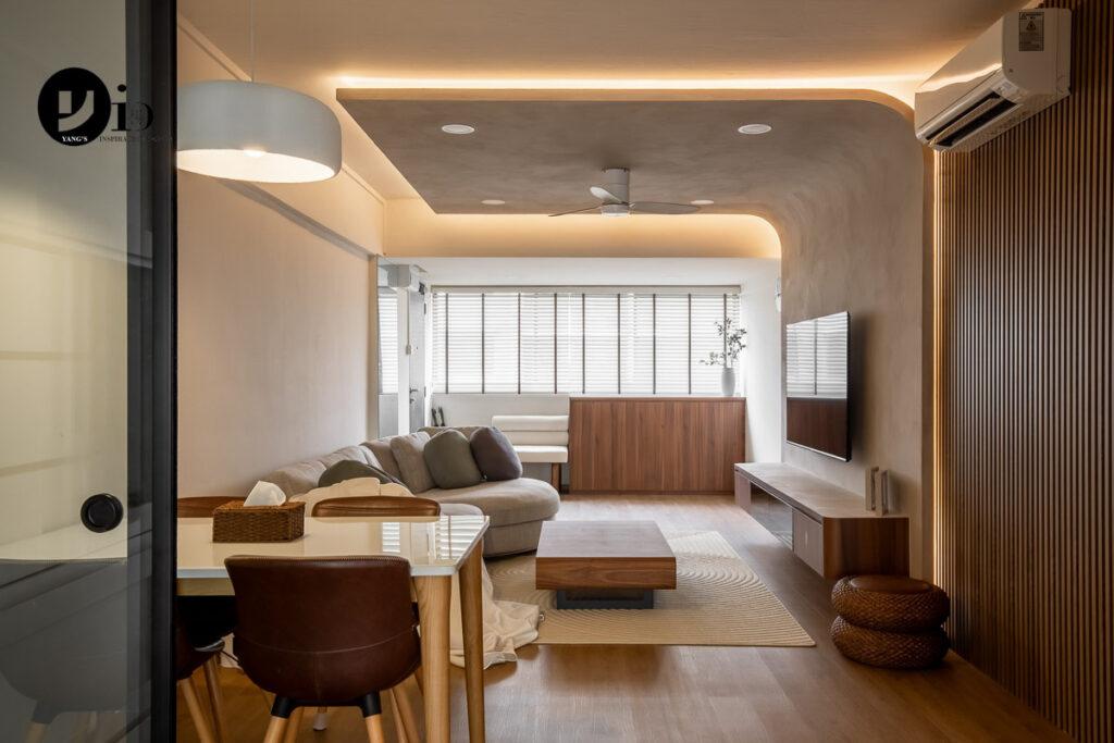 An HDB Renovation at Towner Road by Randall. We created a curved ceiling feature here, which resulted in a cosier living room, perfect for nesting.