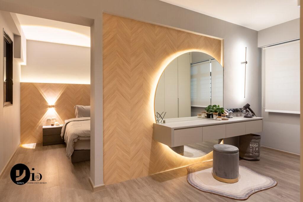 An HDB Renovation at Compassvale Bow by Ken. A bespoke moon-shaped vanity mirror juxtaposed against the sharp edges of the chevron patterns on the wall.