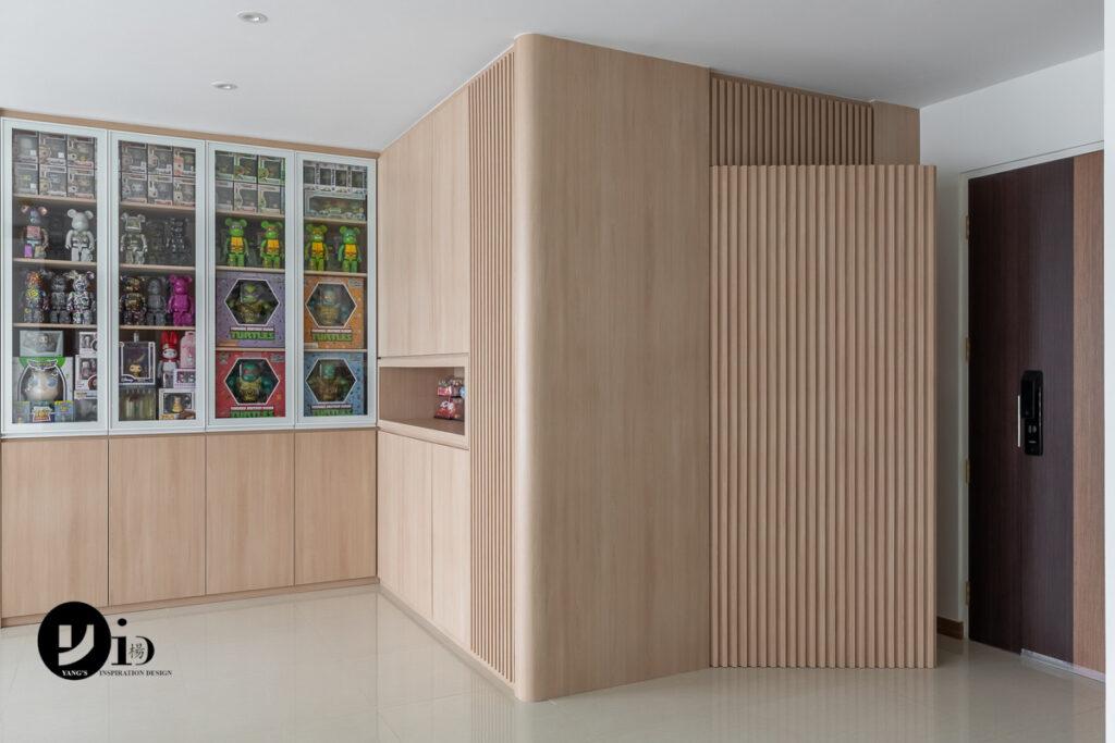 An HDB renovation at Clementi Ave 1 by Kenneth. The shoe cabinet features a gentle rounded edge, in contrast with the straight lines of the fluted panelling.