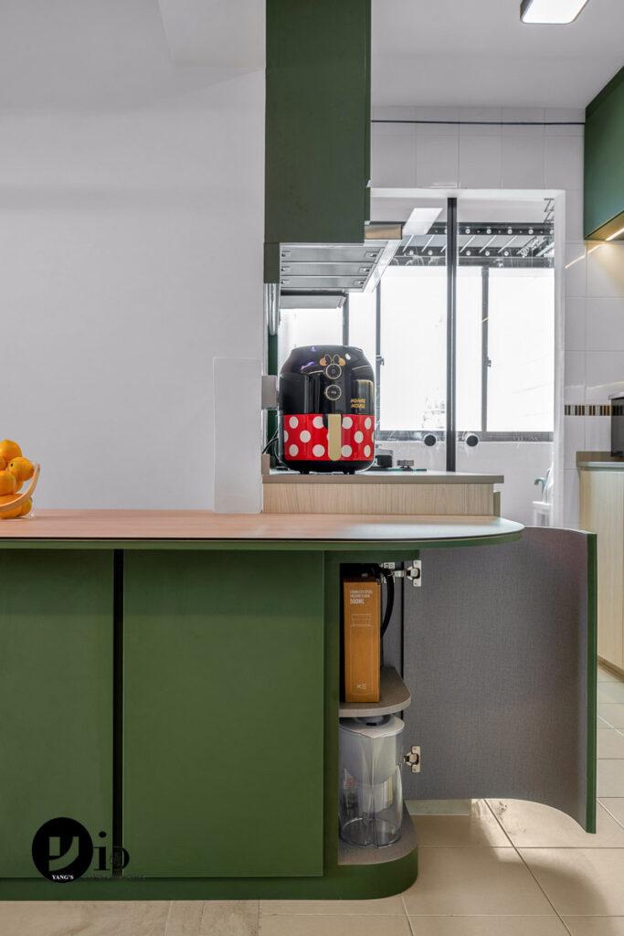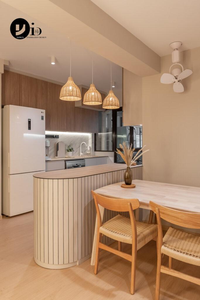 An HDB Renovation at Compassvale Bow by Ken. A kitchen peninsula with a curved shape at one end.