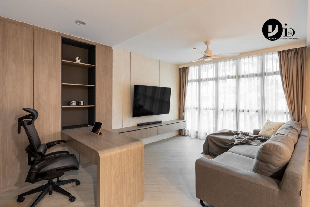 An HDB Renovation at Segar Road by Jason. With the desk and sofa so close together, there isn’t much space to move around. The curved edge of the desk allows for a smoother and safer flow of traffic in and out of the living room.