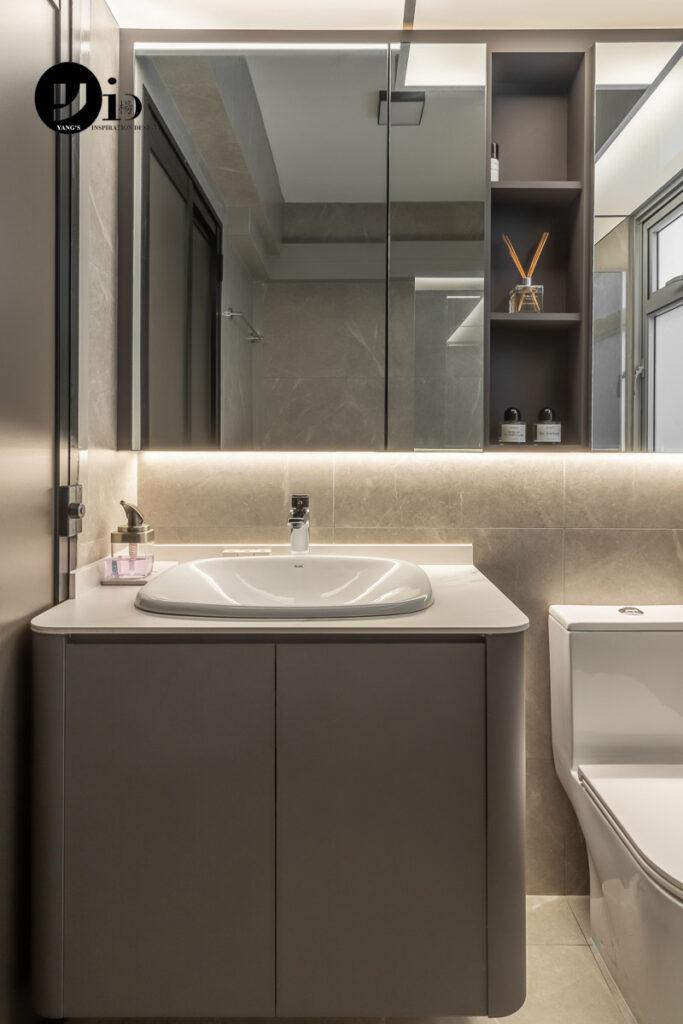 An HDB renovation at Woodlands Ave 9 by Abby. Rounding the edges of the bathroom vanity.