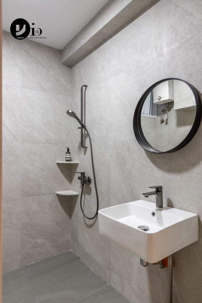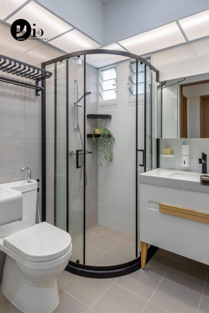 An HDB renovation at Tampines St 21 by David. A curved shower enclosure.